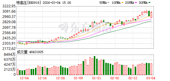 早盘,特高压板块集体狂飙。板块指数由跌转涨,早盘一度大涨4%,涨停或涨幅超10%的个股数量一度达12只。